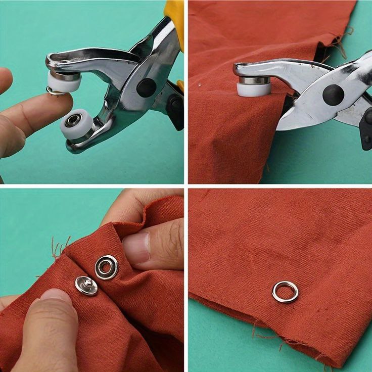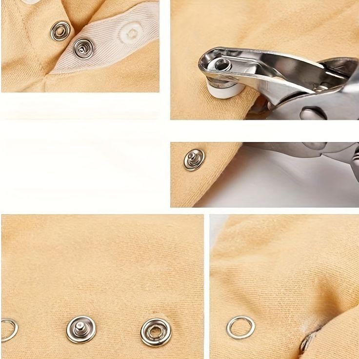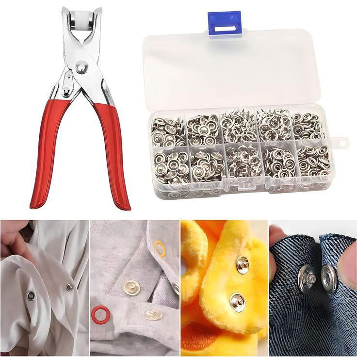 الأداة معاها كباسين معدنية بجودة عالية، تستخدميها على البيجامات، الجواكت أو أي لبس محتاج تعديل.